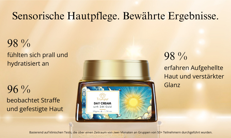 Erleben Sie mit Tagescreme mit 24K Gold die perfekte Harmonie von Ayurveda und Innovation – ein transformatives Hautpflegeritual, das Ihre Haut jeden Tag aufhellt, schützt und revitalisiert.