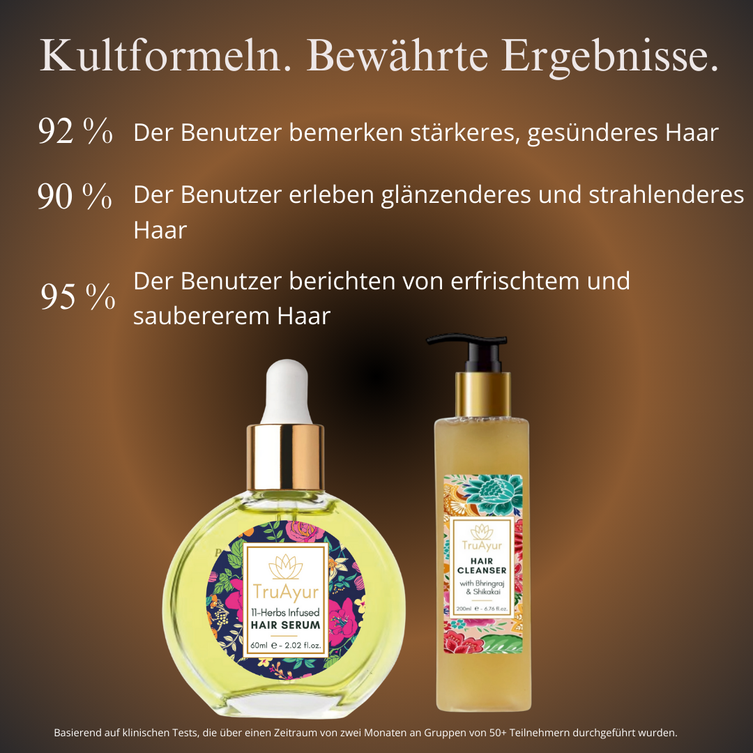 Die Ergebnisse können variieren, aber viele Benutzer bemerken innerhalb weniger Wochen nach regelmäßiger Anwendung stärkeres, glänzenderes und gesünderes Haar. Der Haarreiniger verbessert die Gesundheit der Kopfhaut und reduziert Haarbruch, während das Haarserum die Geschmeidigkeit verbessert, Kräuselungen reduziert und ab der ersten Anwendung für Glanz sorgt.