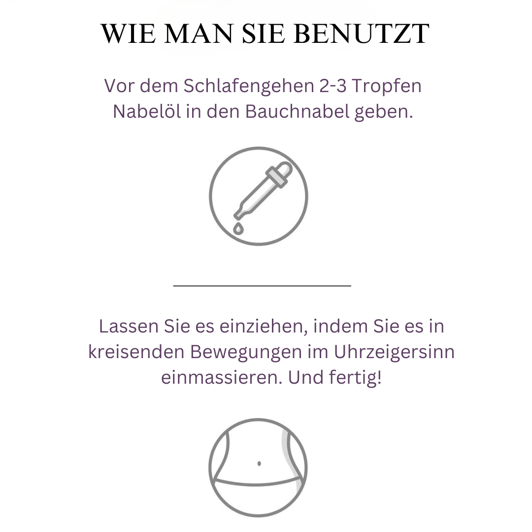 Tragen Sie ein paar Tropfen des Öls direkt auf Ihren Nabel auf und massieren Sie die Stelle vor dem Zubettgehen einige Minuten lang sanft in kreisenden Bewegungen. Lassen Sie das Öl über Nacht einziehen, um den größtmöglichen Nutzen zu erzielen.